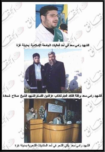 لم يكن نبأ استشهاد المجاهد رامي خضر سعد أو إصابته أمام أصدقائه و هو في خضم المواجهة غريبا على احد لما عرف عنه من شجاعة و إقدام . ولد المجاهد رامي سعد في حي الشجاعيه بغزه و هو حي شعبي و مكتظ , ولد لوالدين متدينين ربياه على الإيمان بالله و على موائد القران . انتقل رامي سعد إلى مصر مع عائلته و هو صغير و عاش فترة طويلة بها لان والده يعمل هناك . و عندما عادت العائلة إلى الوطن عاد إلي وطنه الأم و إلي حيه الذي أحبه . انضم رامي لجماعة الإخوان المسلمين و هو في الخامسة عشر من عمره و كان شديد الغيرة على الدين و على أمور المسلمين ، وكان مثالا للالتزام و قدوة لإخوانه الذين أصبح أميرا لمجموعة منهم . انهى رامى دراسته الثانوية عام 1996 بتقدير جيد أهله لدخول كلية الهندسة في الجامعة الإسلامية بغزة . وكان طالبا مجتهدا و خلوقا مبدعا في دراسته يجتهد في تحصيل العلم و المعرفة المرتبطة بدراسته و لم يهمل في هذه الفترة المطالعة التي يعشقها و ينفق الكثير من مصروفه الخاص لقاء الكتب التي يشتريها . انضم رامي إلى مجلس طلاب الجامعة و احتل فيه أمين الصندوق بعد انتخابات المجلس للعام 2000 . و قد أبدع في عمله في المجلس و خدمة إخوانه الطلاب على حساب دراسته وكان له مواقف شديدة و صلبه في وجه إدارة الجامعة عندما كانت تحاول اتخاذ قرارا ما لا يصب في مصلحة الطلاب . كان معروف عنه انه شخص إيماني روحاني و قد اثر كثير بطلاب الجامعة و غيرهم و خصوصا في ليالي رمضان لما يتمتع به من نداوة الصوت و جميل الألفاظ . لم يكن الشهيد المجاهد رامي سعد ان يترك فرصة للجهاد دون استغلالها لما عرف عنه تدينه وحبه الشديد للجهاد وغيرته الشديدة على الإسلام والمسلمين . فمنذ أول يوم من انتفاضة الأقصى شارك رامي وبقوة في أول مسيرة حاشدة للجامعة الإسلامية بوصفه أحد أعضاء مجلس طلاب الجامعة ، وأم جموع المصلين في صلاة الغائب على أرواح الشهداء في ميدان فلسطين ، ولم يستطيع البقاء مكتوف الأيدي فشارك في فعاليات هذه الانتفاضة حيث كان يذهب يوميا إلى مناطق التماس ليشارك أبناء شعبه في جهادهم ضد الصهاينة البغاة . انضم رامي إلى كتائب الشهيد عز الدين القسام (الوحدة الخاصة 103) في أول شهر من الانتفاضة وكان على علاقة وثيقة وأبوية مع الشيخ المجاهد صلاح شحادة وكان يقول له الشيخ شحادة أنت ابني الذي حرمت منه . " استشهد الشيخ صلاح شحادة في المذبحة البشعة التي ارتكبها العدو الصهيوني التي نفذتها طائراته من نوع (أف-16) الأمريكية الصنع ضد "حي الدرج" في مدينة غزة بعد منـتصف ليلة الثلاثاء 23/7/2002م راح ضحيتها 17 عشر شهيدًا معظمهم من الأطفال ، وقد اعترف الجيش الإسرائيلي أن طائرة إسرائيلية ألقت قنبلة تـزن طنـًا خلال الغارة على منزل الشهيد الشيخ صلاح شحادة" .